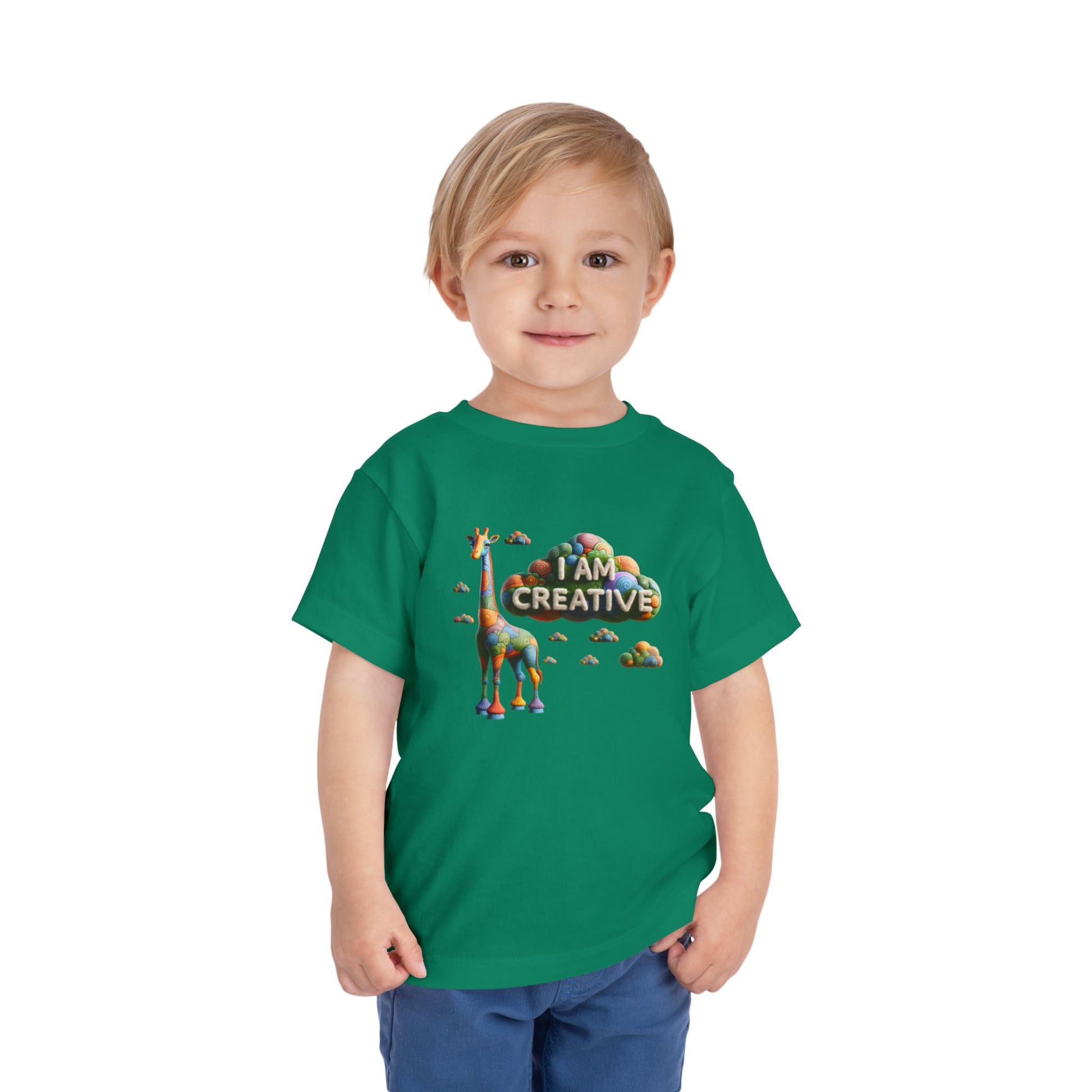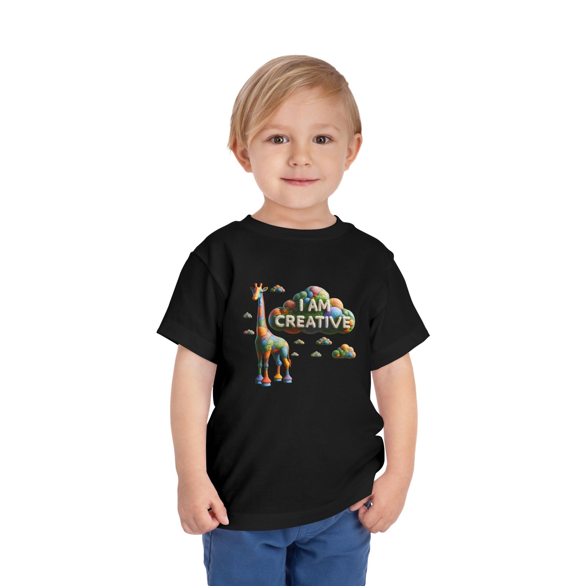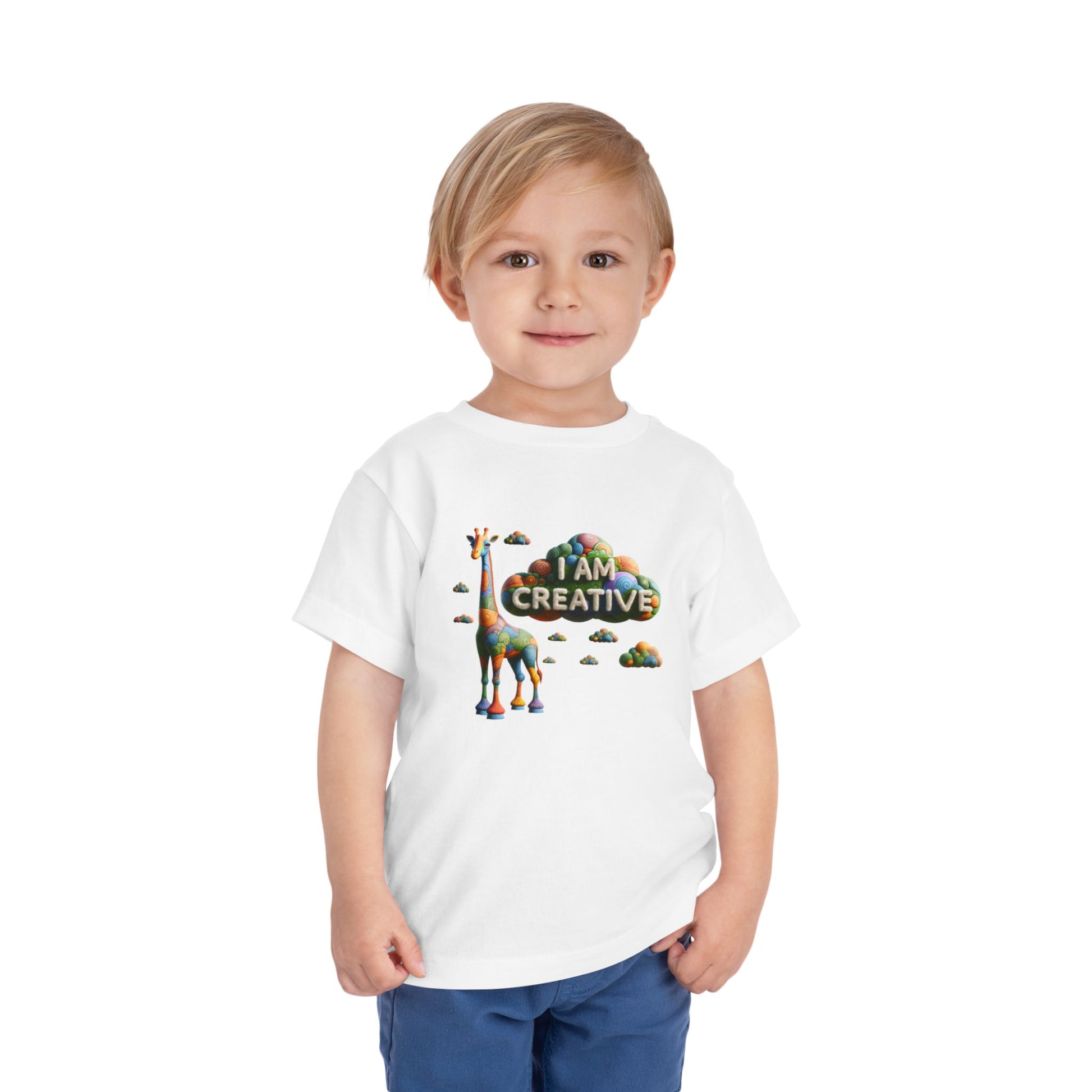 Unleash your child's creativity with our Giraffe toddler graphic tees. This childs t shirt features an enchanting giraffe, perfect for boosting confidence and creating their internal paradise. Crafted from super-soft fabric, it's one of the most comfortable kids shirts they'll ever wear. Let their imagination soar with these inspirational t shirts. Designed to bring joy and the sentiment of I AM CREATIVE, it's a must-have for every little explorer's wardrobe.